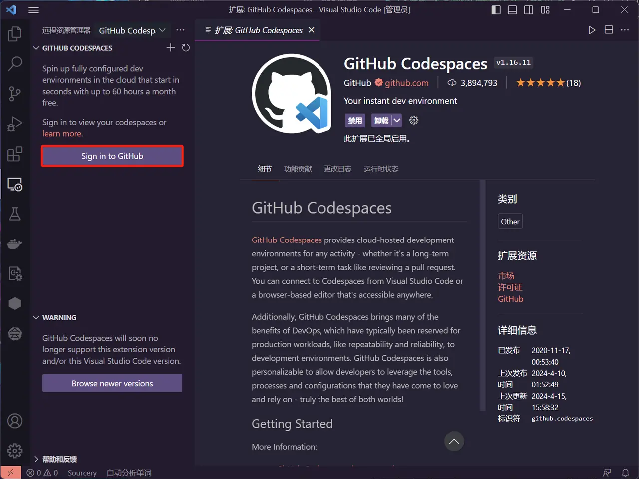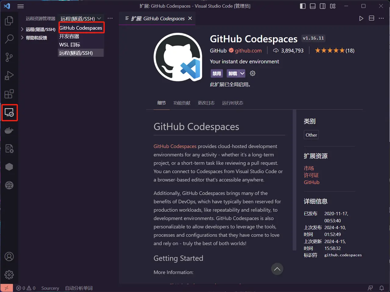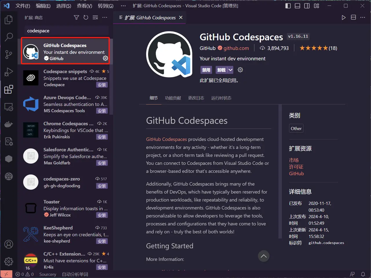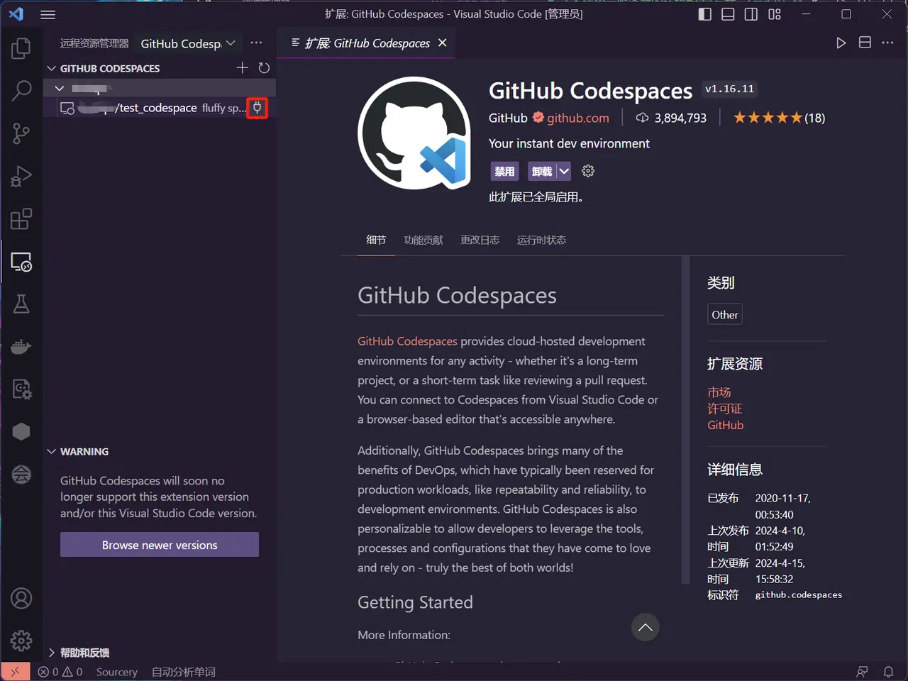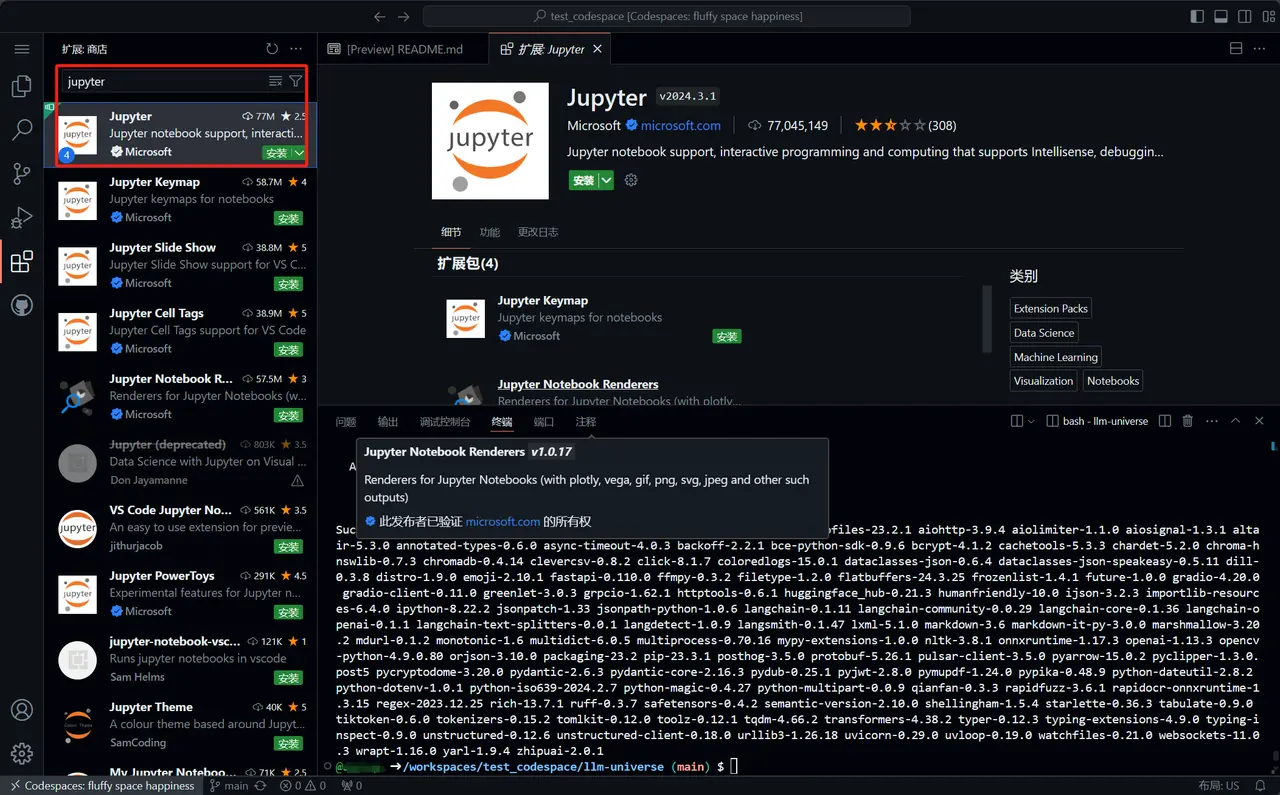 - 打开 VSCode,搜索 codespace 安装插件