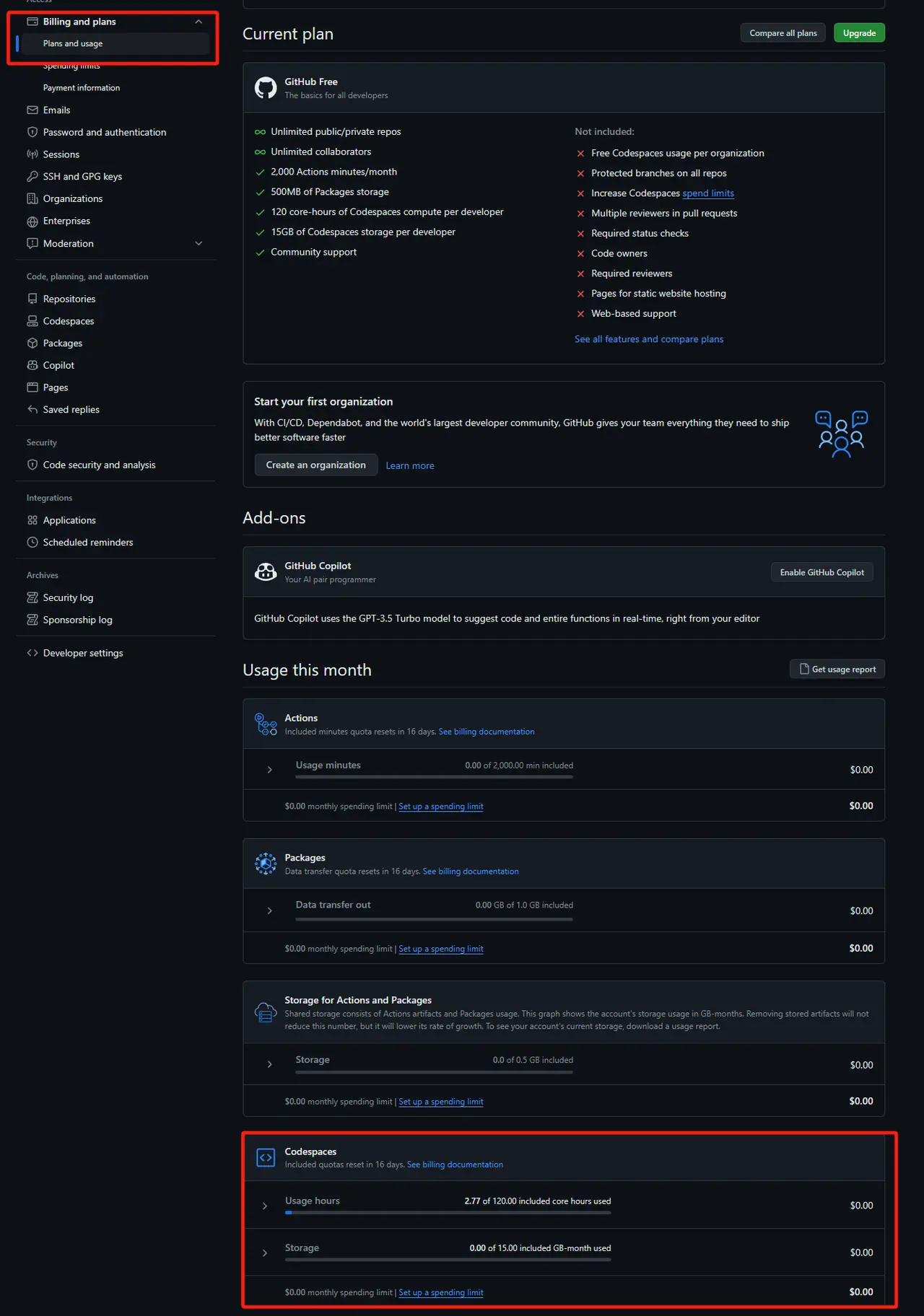 找到 GitHub 的账户设置后,可以在Plans and usage中看到剩余的免费额度