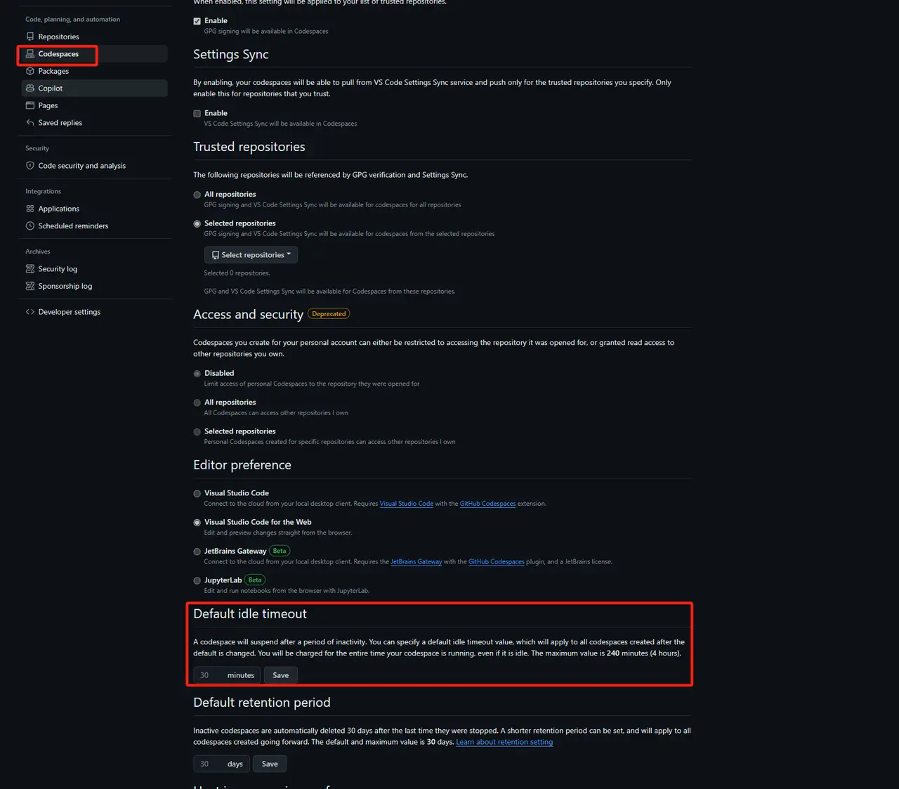 - codespace 设置,挂起时间建议调整(时间过长会浪费额度)