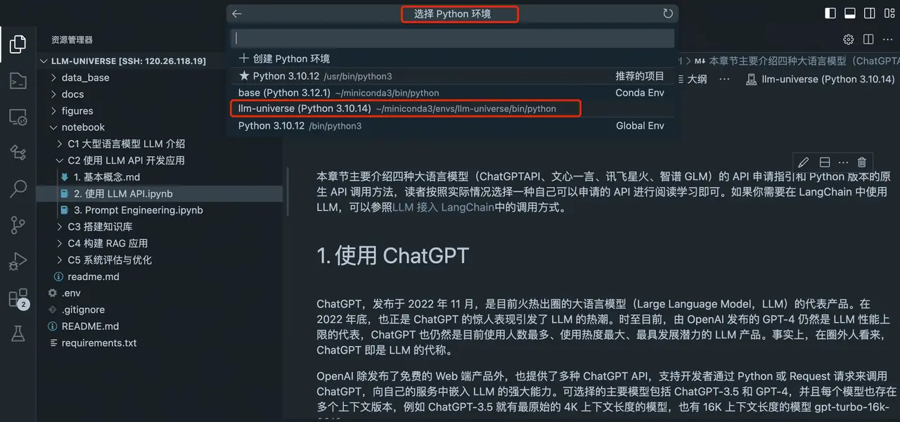 选择 Python后进入环境列表,并选择我们配置好的环境llm-universe。