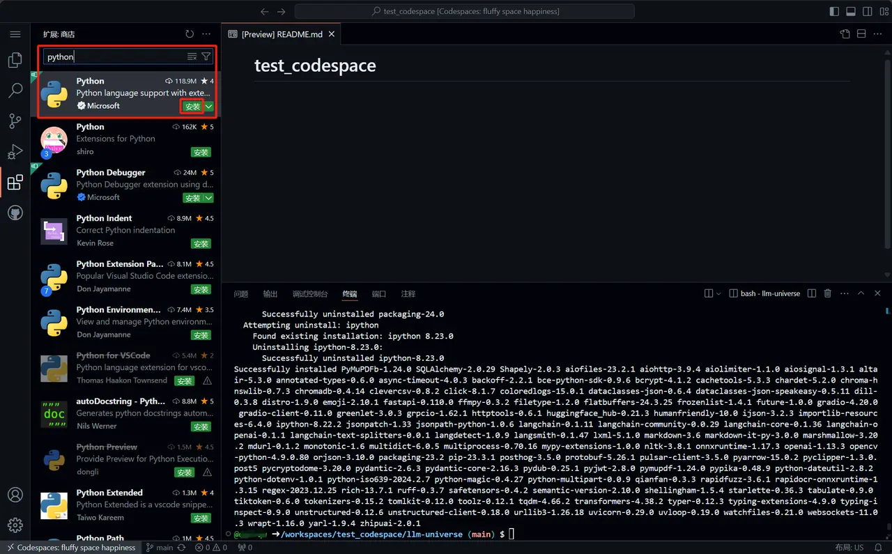 由于每个存储库都可以设置一个独立的 codespace,所以这里我们不需要安装 conda 环境。且因为 GitHub 服务器在国外,无需配置国内镜像源。