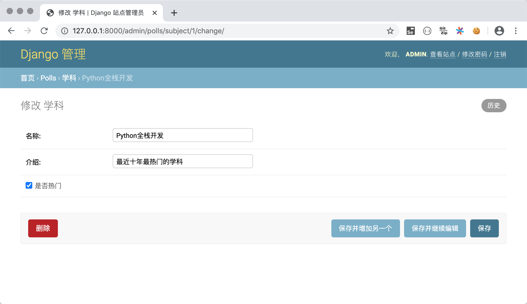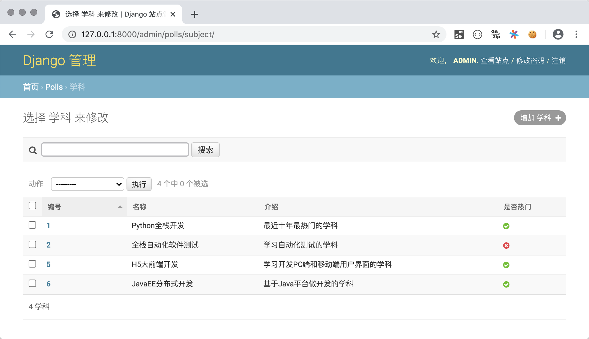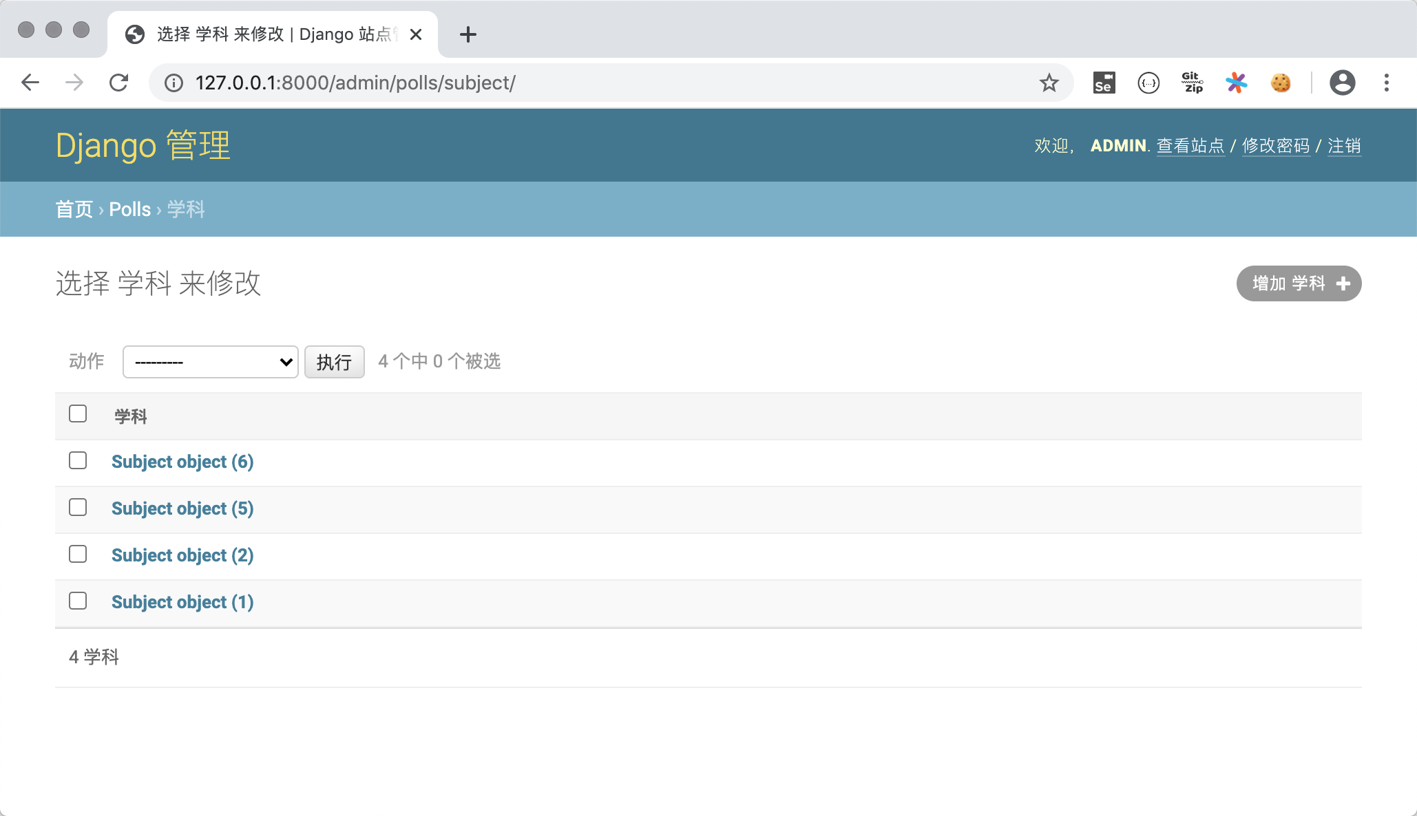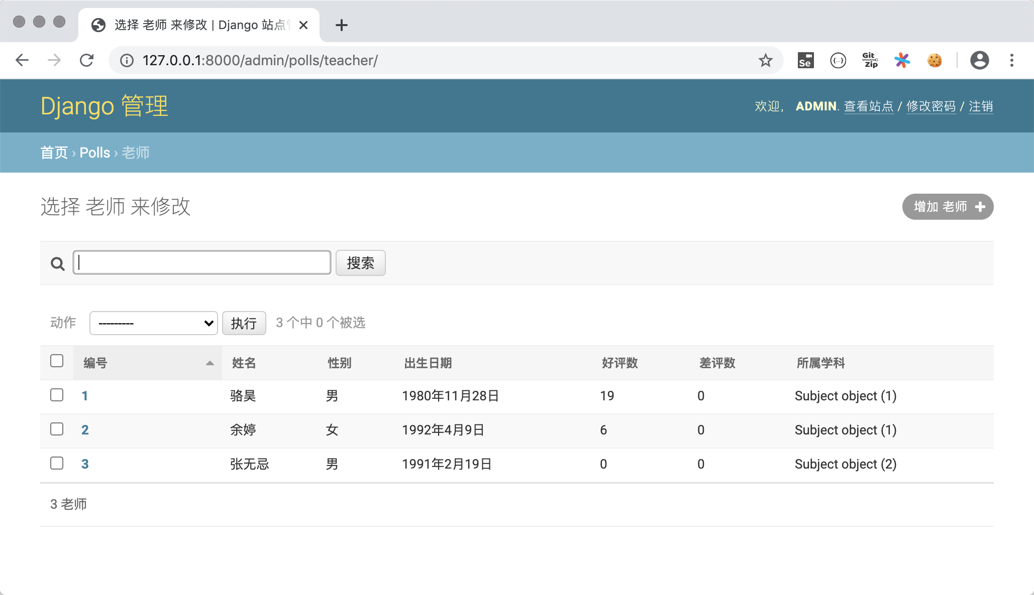 Subject类添加__str__魔法方法,并在该方法中返回学科名字。这样在如上图所示的查看老师的页面上显示老师所属学科时,就不再是Subject object(1)这样晦涩的信息,而是学科的名称。