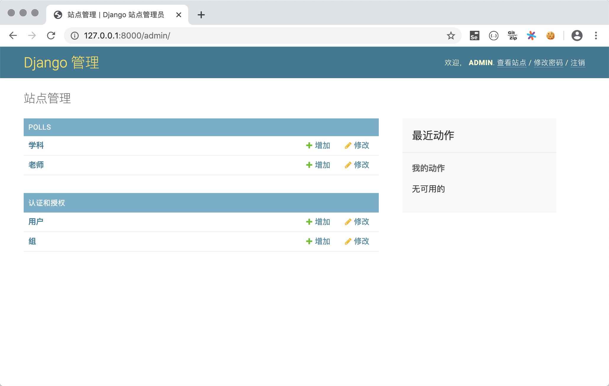 注册模型类后,就可以在后台管理系统中看到它们。